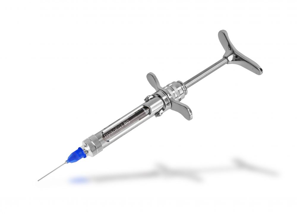 Ein hoch konzentriertes Hyaluronsäure-Gel aus einer vernetzten (1,6%) und einer natürlichen HA (0,2%). hyaDENT BG zeichnet sich durch ein langsames Abbauverhalten (mehrere Wochen) aus.